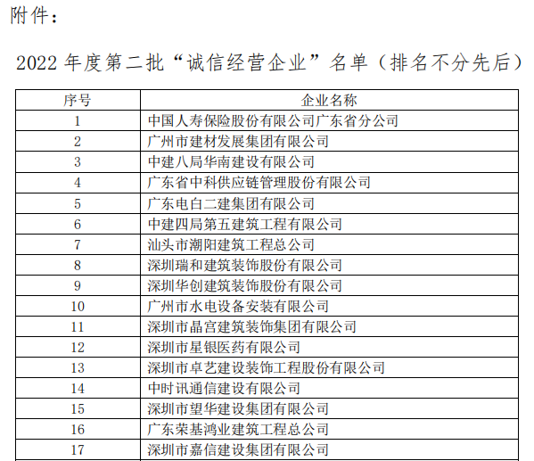 为进一步推进企业依法管理、诚信经营,营造安全放心、公平诚信的经济发展环境, 提高企业市场知名度和竞争力,促进我省诚信经营体系建设。依据《诚信经营企业评定规范》(T/GDMA 54-2023)团体标准,广东省市场协会目前已完成2022年度第二批“诚信经营企业”评定工作,现将结果公示如下: